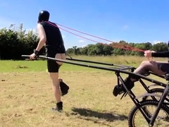 Ballbusting CFNM domina in leather kicks sub outdoor