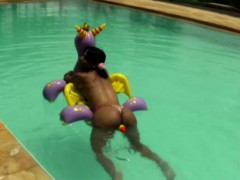 Cheerful teen shemale shows off sexy ass in thongs poolside