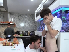 Boys fuck behind their stepdaddy and invite him to join them