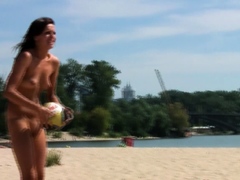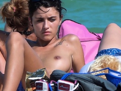 Adorable nudist teen friends enjoy sunbathing at the beach